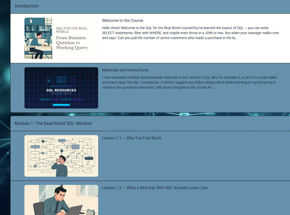 Each module is short, direct, and built to be applied immediately. No fluff, no 40-hour time sink. Just the moves you’ll actually use in a real data job.
